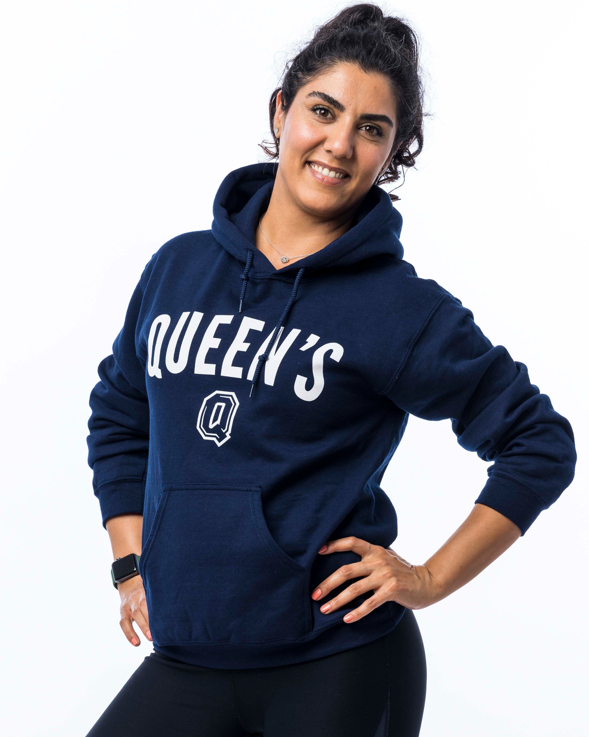 Classic fit hoodie with white Queen's and athletics Q screen printed on the front.