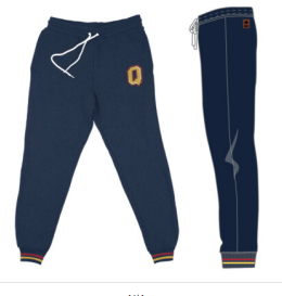 Navy draw string sweatpants with Q embroidery, cuffed tri colour ankles.