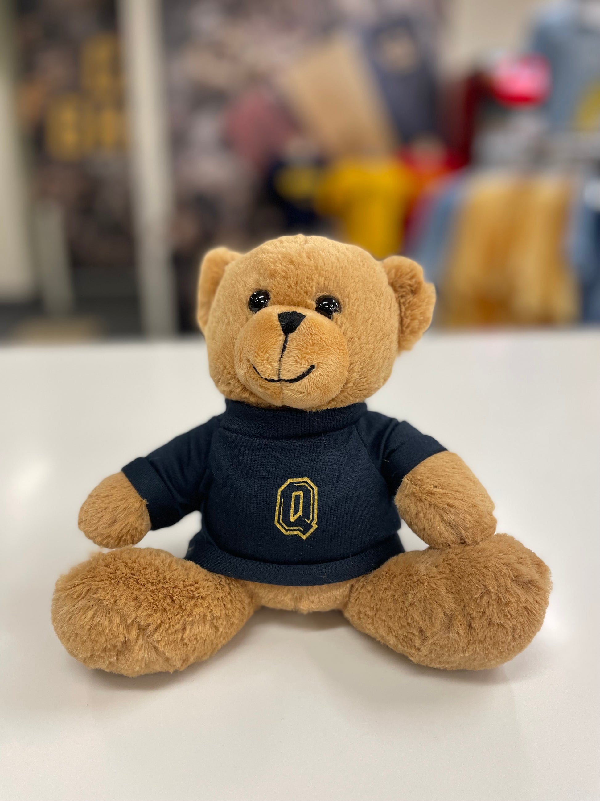 Adorable 7' brown plush Q Teddy Bear wearing a blue Q t-shirt.